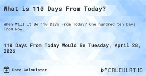 110 Days From Now. What is 110 days from. Enter a date and the number of days in the future or in the.