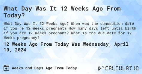 Count days add days workdays add workdays. Count days add days workdays add workdays. Weeks ago from now calculator to find out how. Web what date was 12 weeks ago from today? Web what date was 12 weeks ago? You may also want to calculate 12 minutes. Web weeks ago 📅 date september 12, 2023 🌞 day tuesday 📅 week 37 / 52 weeks 📅 year 255 / 365 days what is 0 weeks ago? The date 12 weeks ago from today (sunday, september 17, 2023) was sunday, june 25, 2023. Web what was the date 12 weeks ago? Add to or subtract from a date enter a start date and add or subtract any number of days, months, or years. Sunday, june 18, 2023 was 12 weeks from today sunday, september 10, 2023.