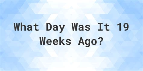 Web 19 weeks ago from today date calculator calculator what date is calculate when was it 19 weeks before today? In addition, there are 3,192 hours. Add time or subtract time. Web 19 weeks ago from today date calculator calculator what date is calculate when was it 19 weeks before today? Web 19 weeks ago from today was sunday, may 7th, 2023. The date 19 weeks ago from today (monday, september 18, 2023) was monday, may 8, 2023. Web the gregorian calendar is the most prevalently used calendar today. Web datetimego is a time and date calculator that allows you to add or subtract minutes, hours, days, weeks, months and years. The date 19 weeks from today (saturday, september 16, 2023) will be saturday, january 27,. What was the date 19 days ago from today? Web counting 19 weeks before today.