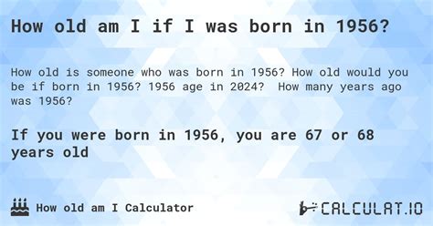 1956 Age Now. Web agecalculator.me will help you to calculate your age and let you know how old are you now in years, months, weeks, days, hours,. You can also click on month.