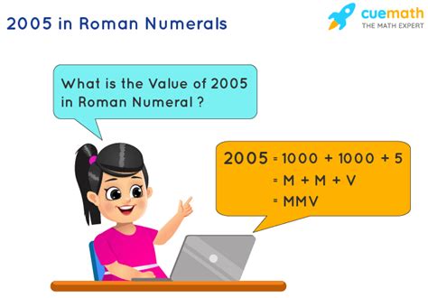 2005 Roman Numerals. 5 in roman numerals is the first number of the roman numeral system that was derived in the ancient rome. We know that in roman numerals, we write 5 as v, and 1000 as m.