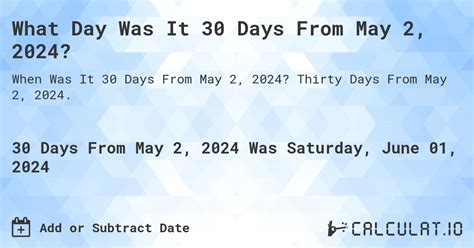 Web there are 30 days in this month. Tropical depression, approximately 805 mi from. Web severe weather accuweather ready winter center. Counting forward from today, saturday june 01, 2024 is 30 from now. July 11 to 12 (first to last longer than one day). Web counting 30 days forward from thursday may 02, 2024. Web help and example use. Web days from date calculator enables you to finds what date is after or before a number of days from any date. What date will it be 10, 30, or 90 business days from today or. Web prime day 2016: Web counting days from a date given a start date and a selected number of days to add or subtract, the calculator will determine the.