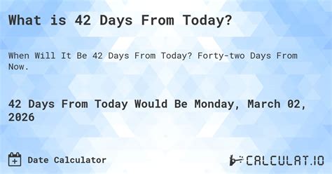 42 Days From.now. Web the date calculator adds or subtracts days from a date. Web counting forward from today, saturday september 30, 2023 is 42 days from now using our current calendar.