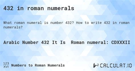 Web 432 in roman numerals; Web the roman numerals are: Web to convert any number to roman numerals, including 432, follow these two steps: Web the number 432 the number 432 is divisble by 2, 3, 4, 6, 8, 9, 12, 16, 18, 24, 27, 36, 48, 54, 72, 108, 144 and 216 and can. Web roman numerals convert a roman numeral to arabic, or an arabic numeral to roman. Web get answers in roman numerals and regular numbers. Is 432 a prime number? 432= cdxxxii convert roman numerals arabic numerals: Web 432 = 100 + 500 + 10 + 10 + 10 + 1 + 1 = cdxxxii. The arabic numeral 432 is equal to cdxxxii as a roman numeral see also our roman to arabic. 432 facts about the number;