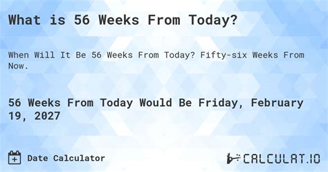 When will it be 56 weeks from today? When will it be 56 weeks from today? Web thursday, october 3 , 2024. Web what will be the date 56 weeks from today? The answer is october 12, 2024. Web the date calculator adds or subtracts days, weeks, months and years from a given date. What date is 56 weeks from now. Include the time include only certain weekdays repeat: