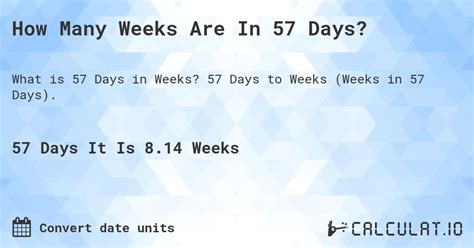 57 Days To Weeks. Web convert 57 days to weeks. 5 days to weeks = 0.7143: