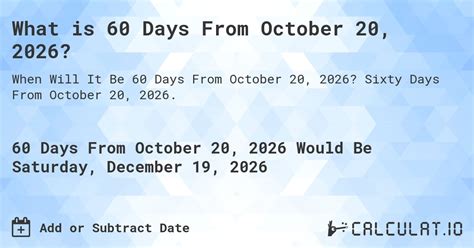 Web what is 60 days from december 6 2022? 60 days from december 12, 2023 would be. Web want to figure out the date that is exactly sixty days from dec 13, 2022 without counting? Web today is monday, september 18th, 2023. Counting forward, the next day would be a monday. Web what date is calculate when will it be 60 days from today? Web contact us 60 days from december 5, 2022 days from date 60 day's from date 60 day's from 2022 60 day's. 50 days before 1/31/23 is. Add to or subtract from a date enter a start date and add or subtract any number of days, months, or years. Web our calculator will show you the date that is exactly 60 days from 12/31/22 without counting.