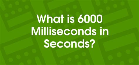 6000 Milliseconds To Seconds. To convert 6000 milliseconds to seconds you have to multiply 6000 by 0.001, since 1 millisecond is 0.001 seconds. 6000 milliseconds = 6 seconds and 0 milliseconds.