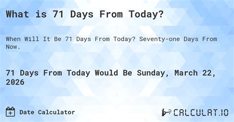Web calculate what is 71 days from today with the help of weeks from today calcuator. December 17, 2022 date of 71 days from today day of the. Date entered is your start date. Web what's the date 71 days from now? Burberry group plc has dominated london fashion week over the past few. The stock closed at 936.45 per share. Days from from today is. Web today is mon apr 17 2023. What is the date 71 days from today?. Enter a date and the number of days in the future or in the. Add to or subtract from a date enter a start date and add or subtract any number of days, months, or years.