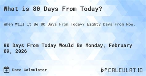 80 Days From.today. Web 80 days from today this simple calculator will help you determine the date by adding 80 days from today. The date 80 days from today (wednesday, september 6, 2023) will be.