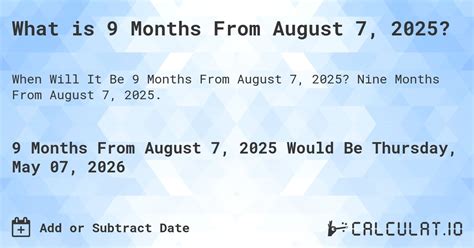 9 Months From August. Use the day/week/month/year buttons to enter the days, weeks, months and/or years you wish to add or subtract. Add to or subtract from a date.