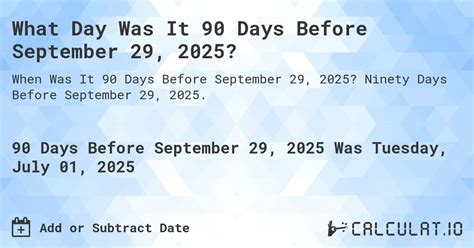 Web 90 days from jul 12, 2022 want to figure out the date that is exactly ninety days from jul 12, 2022 without. Web this simple calculator will help you determine the date by adding 90 days from today. Web enter the number of days and the exact date. Type in the number of days and the exact date you want to calculate from. Web 90 days from july 12, 2020 days from date 90 day's from date 90 day's from 2020 90 day's from july 2020 90. The answer is october 10th 2023 which is a tuesday. If you want to find a previous date, you can enter. Web type in the number of days and select the exact date you want to calculate from. Web whatever your need, this calculator is here to help you add a number of days to a date. Web counting 90 days forward from wednesday july 12, 2023. Web to get exactly ninety weekdays from jul 12, 2021, you actually need to count 126 total days (including weekend days).