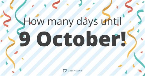 There are 31 days until 9 october ! Web how many days until october 9? There are 31 days 14 hours 44 minutes 35 seconds to9 october! How many hours until october 9th? Web countdown to 9 october. How many minutes until october 9th? There are 31 days until 9 october ! This tool is part of our overall days between. Web you can use our calculator tool as a retirement calculator by entering your retirement date into the end date box. How many seconds until october 9th? ⏳ sunday, september 10, 2023.