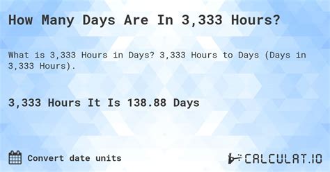 Web 333.07 hours equals 13.87791667 days. Web 35 rows decimal places result in plain english 330 hours is equal to about 13.8 days. Web the hurricane had sustained wind speeds of 100 miles per hour. 30 minutes = 1.5 hours exact result decimal places. 333.09 hours equals 13.87875 days. Web this hours calculator computes the number of hours and minutes between two times. Web 0.037988460 years result rounded decimal places result in plain english 333 hours is equal to about 0.0380 years. The time 333 hours from now (wednesday, august 9, 9:59:00 pm) will be. 33.03 hours equals 33.03 hours. Here we answer the question how many hours is 333 minutes?