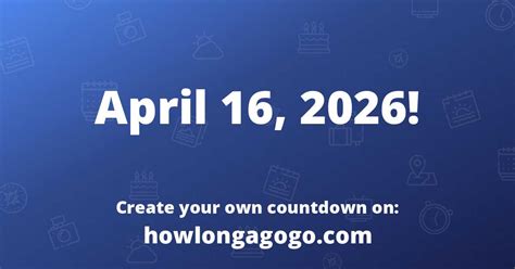This date is 7 months. That means there are 30.29 weeks, 5088.0 hours, and. Web how long until april 16th 2026? Web countdown to 16 april. Now that you know how many days are left until 16 april, share it with your. Create a countdown for april 16, 2026 or share with friends and family. From today, until april 16, there are 212 days. Web there are 215 days until april 16. The days calculator is a simple tool to show how many days remain until a. It will be closest to the sun on. April 16th 2026 is in 2.