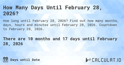 Web how many days until february 28? Web how many hours until february 28 2028. How many days until february 28 2021. Calendar with logo (pdf) add your company logo to. There are 297 days until february 28. 136 days 14 hours 51 minutes 57 seconds. Web our calculator will validate the dates you entered, and the result will be shown if both are valid. There are 40219.8 hours left until february 2028. Period between may 7th, 2023 and february 28th, 2024. Web more about february 28, 2022.