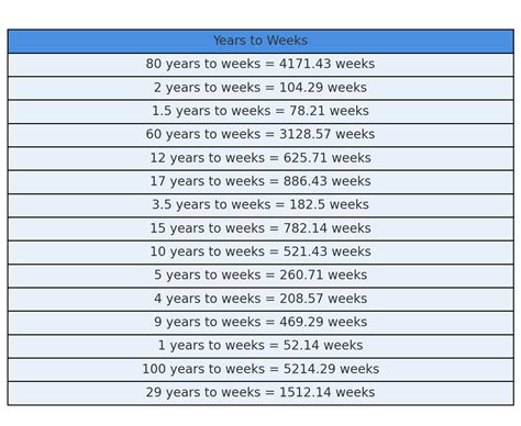 In scientific notation 12 years =. 1 year = 52 weeks + 1 day = 365.2425 days = 52.1775 weeks. Web 12 years to weeks (weeks in 12 years). Web amount from to calculate swap units ↺ 1 year = 52.1775 weeks exact result decimal places years in the gregorian calendar, a year has on average 365.2425 days. Web calculate swap units ↺ 12 years = 626.13 weeks exact result decimal places result in plain english 12 years is equal to about 626 weeks. What is 12 years in weeks? To convert 12 years into weeks we have to multiply 12 by the conversion. Web 1 yr = 52.1775 wk. Years to weeks conversion table