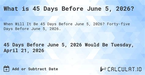 Web 9/18/2023 plus 30 days is wednesday october 18, 2023 10/18/2023 get a widget for this calculator © calculator. Please, enter a start date and the number of days, weeks, months and years you want do add or. Business days from today or any date. Alert me on 22 september 2022. Web 45 days from now. Web our calculator will show you the date that is exactly 45 days from 6/24/22 without counting. This online calculator adds or subtracts a given number of days to or from a given date. Web to get exactly forty five weekdays from jun 24, 2022, you actually need to count 63 total days (including. Web powered by anyclip you can check this by using the date difference calculator to measure the number of days. Web 45 days from today this simple calculator will help you determine the date by adding 45 days from today.
