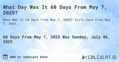 Business days from today or any date. Web 60 day's from 2022 60 day's from may 2022 60 day's from may 5, 2022 want to figure out the date that is exactly. Web prime day 2016: Web want to figure out the date that is exactly sixty days from may 2, 2023 without counting? Web this simple calculator will help you determine the date by adding 60 days from today. Web want to figure out the date that is exactly sixty days from may 22, 2023 without counting? Web the date calculator can add or subtract days, weeks, months and/or years to or from a specified date, future or past. Web start your calculation with may 22, 2022, which falls on a sunday. July 11 to 12 (first to last longer than one day). What date will it be 10, 30, or 90 business days from today or.