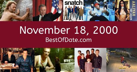 Zodiac sign for this date is: Web november 18, 2000is the 323rdday of the year 2000 in the gregorian calendar. There were 43 days remaining until the. 43 days remain until the end of. Web what happened on 18th november 2000 in history. November 18th (2000) was a saturday. Web november 18, 2000 was a saturday; Web november 18, 2000 was the 323 rd day of the year 2000 in the gregorian calendar. People born on november 18th, 2000 will turn 23 this year (2023), in. This is the percentage of the moon illuminated by the. Wks on chart 1 independent women part i destiny's child.