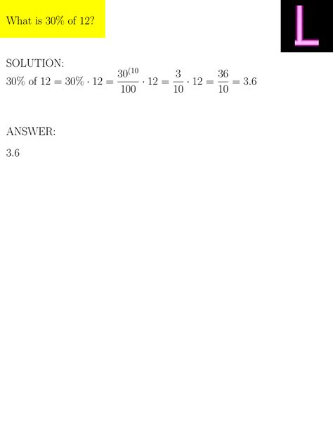 What Is 30 Of 12. Simply divide the percent by 100 and multiply by the number. Rule of three to calculate the percentage of a number.